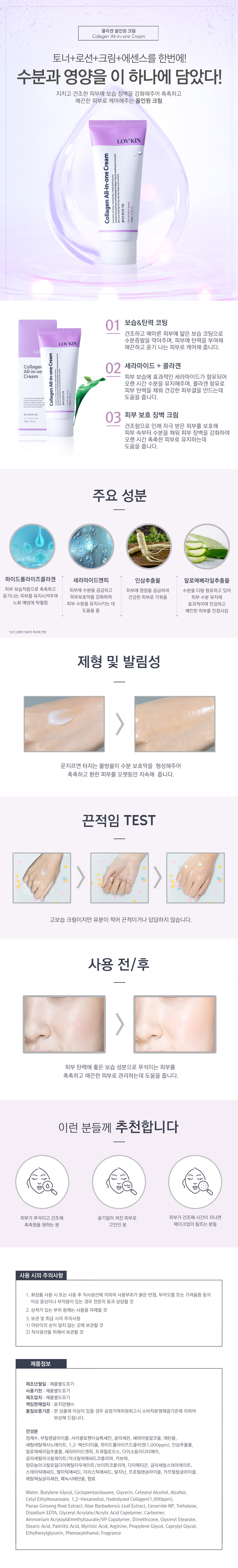 SKIN CARE 콜라겐 올인원 크림 Detail View 세라마이드엔피가 피부 보습에 도움을 주고 콜라겐 성분이 피부에 영양을 공급하여 피부를 더욱 맑고 건강하게 가꾸어 줍니다. 용량 : 100ml